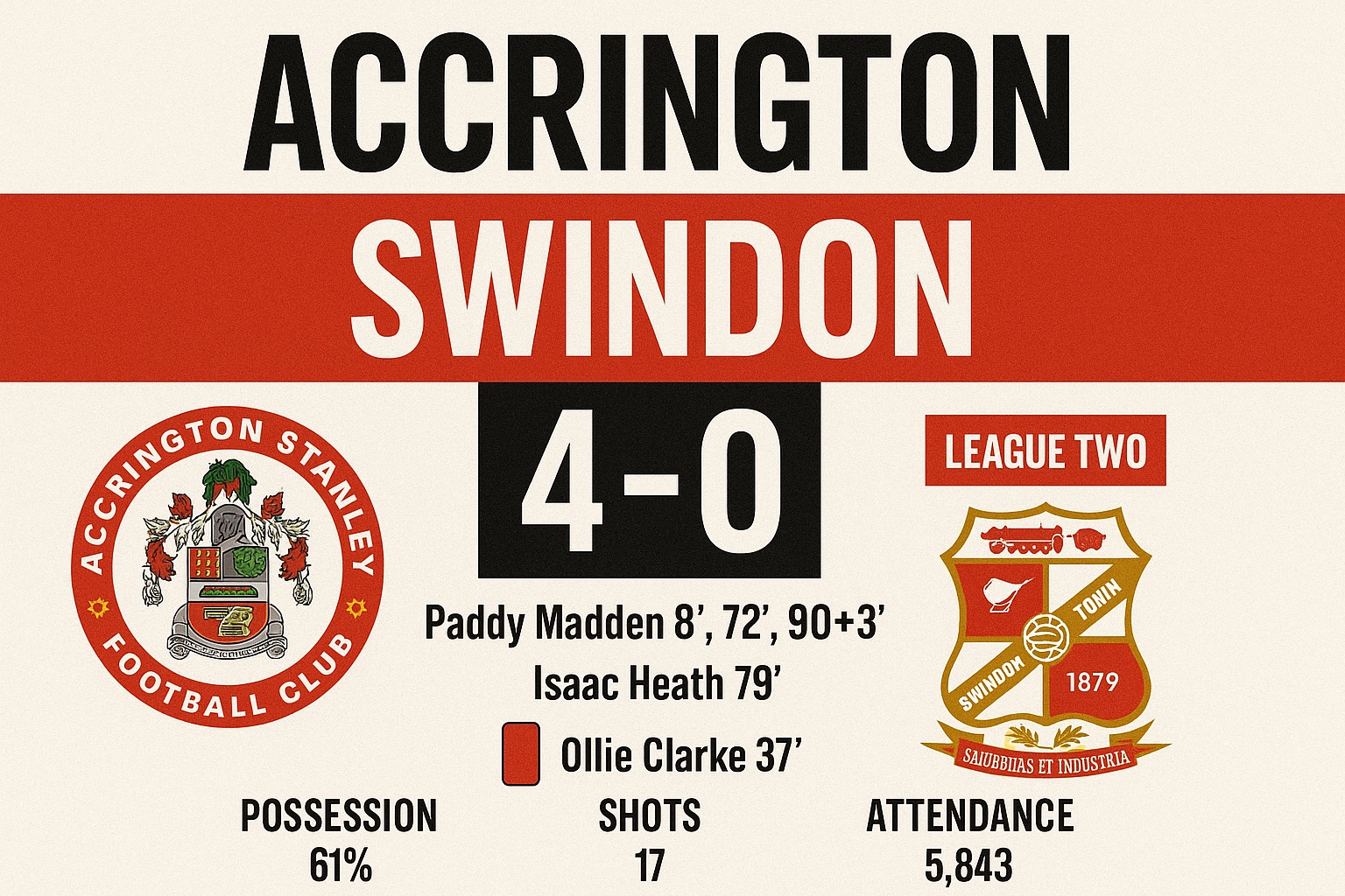 Por Brunno Lemos | Rádio Domm - Accrington, 18 de outubro de 2025 — O Swindon Town F.C. viveu uma tarde para esquecer. Em duelo válido pela League Two, o time foi amplamente dominado e perdeu por 4-0 para o Accrington Stanley, no Wham Stadium. A derrota amplia a sequência negativa dos “Robins”, que voltam a preocupar os torcedores com o desempenho instável fora de casa.