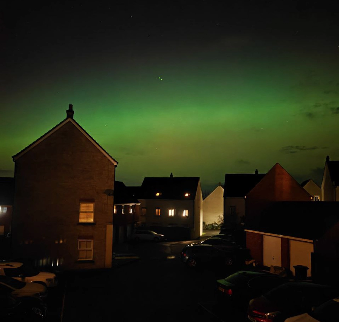 De acordo com astrônomos e serviços meteorológicos, uma tempestade geomagnética moderada a forte está atingindo a Terra, empurrando o chamado “anel auroral” para latitudes mais ao sul do que o habitual. Com isso, regiões onde o fenômeno não costuma aparecer, como Swindon, entram na área de visibilidade.