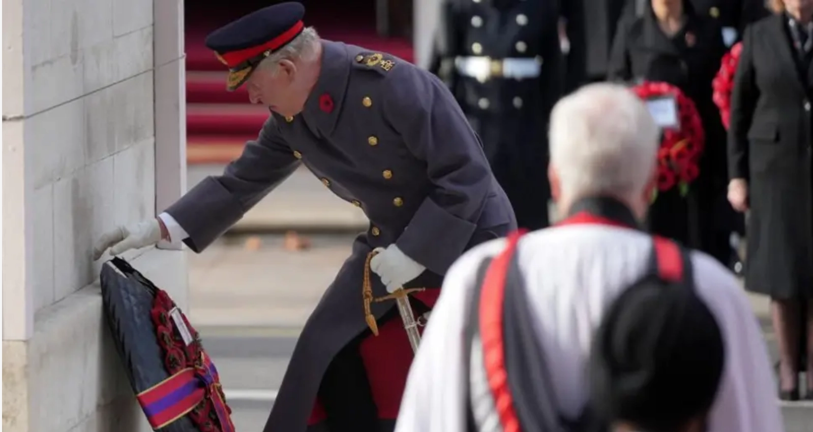 Em uniforme de marechal-de-campo, Charles III depositou a primeira coroa de papoilas vermelhas, símbolo da lembrança e da esperança. Ao seu lado, o Príncipe William, representando a nova geração da monarquia, fez o mesmo gesto com sobriedade e emoção.